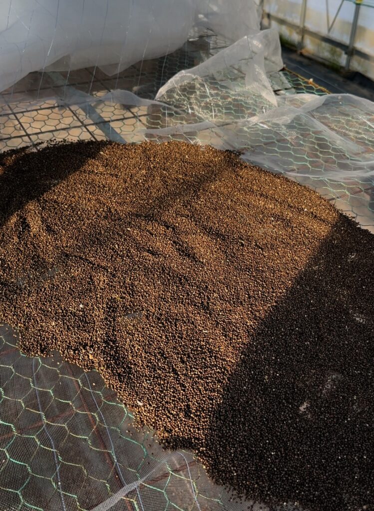 ふるいと唐箕を終えたえごまは、最後に天日干し。
