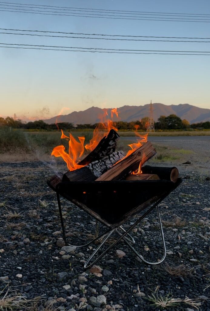 今日も焚き火を準備して、火をつけます。