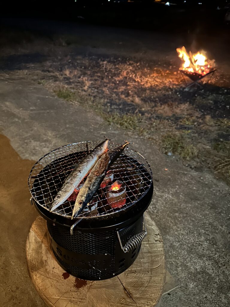 焚き火の炎と秋刀魚の煙、